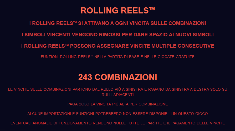 La funzione Rolling Reels si attiva durante le partite di base e le Giocate gratuite, dopo qualsiasi vincita sulle combinazioni. I simboli vincenti vengono rimossi dai rulli e i simboli che si trovano sopra si spostano negli spazi vuoti. Se si formano nuove combinazioni vincenti, la funzione si riattiva. La funzione continua finché non sono più presenti combinazioni vincenti sui rulli.