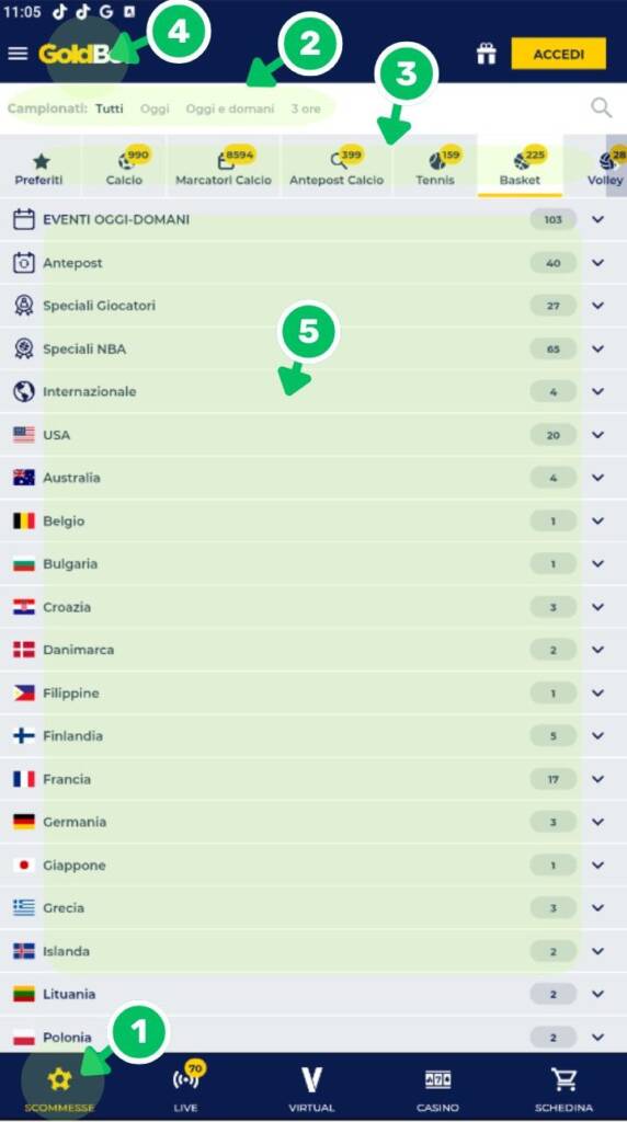- 5. Top Live - Filtro che attiva la visione dei principali eventi in corso al momento con la possibilità di scommettere "Live"