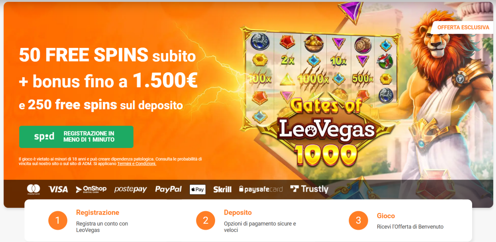 Per poter accedere e giocare su LeoVegas Casinò, è necessario prima di tutto essere iscritti alla piattaforma. Se hai intenzione di registrarti, puoi utilizzare il link qui sotto per poter così accedere a tutti i Bonus e le Promozioni disponibili al momento.