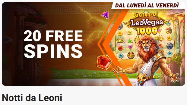 Dalle 21:00 alle 01:00, dal lunedì al venerdì di ogni settimana, l’Olimpo ti attende per farti vivere Notti da Leoni con 20 free spins sul deposito per la slot Gates of LeoVegas 1000.