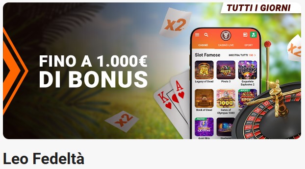 Con LeoFedeltà se giochi alle slot, ai tavoli live e ai game show accumuli punti validi per ottenere un bonus reale fino a 1.000€ ogni mese del 2025.