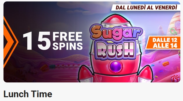 Dal lunedì al venerdì di ogni settimana (dalle ore 12:00 alle ore 14:00), è possibile ottenere 15 free spins sulla slot machine dal sapore di zucchero denominata Sugar Rush.