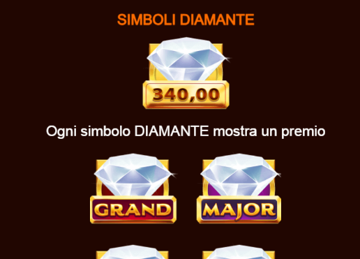 Ogni simbolo Diamante mostra un importo in denaro o 1 dei 4 premi speciali che possono essere raccolti durante la funzione Wild Doppio. Il simbolo Diamante può fermarsi solo sui rulli 3, 4 e 5.