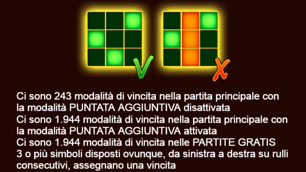 Questo gioco con tutte le modalità offre 243 possibili combinazioni vincenti. Quando la modalità Puntata Extra è attiva, aumenta il numero potenziali combinazioni vincenti a 1.944 nella partita base.