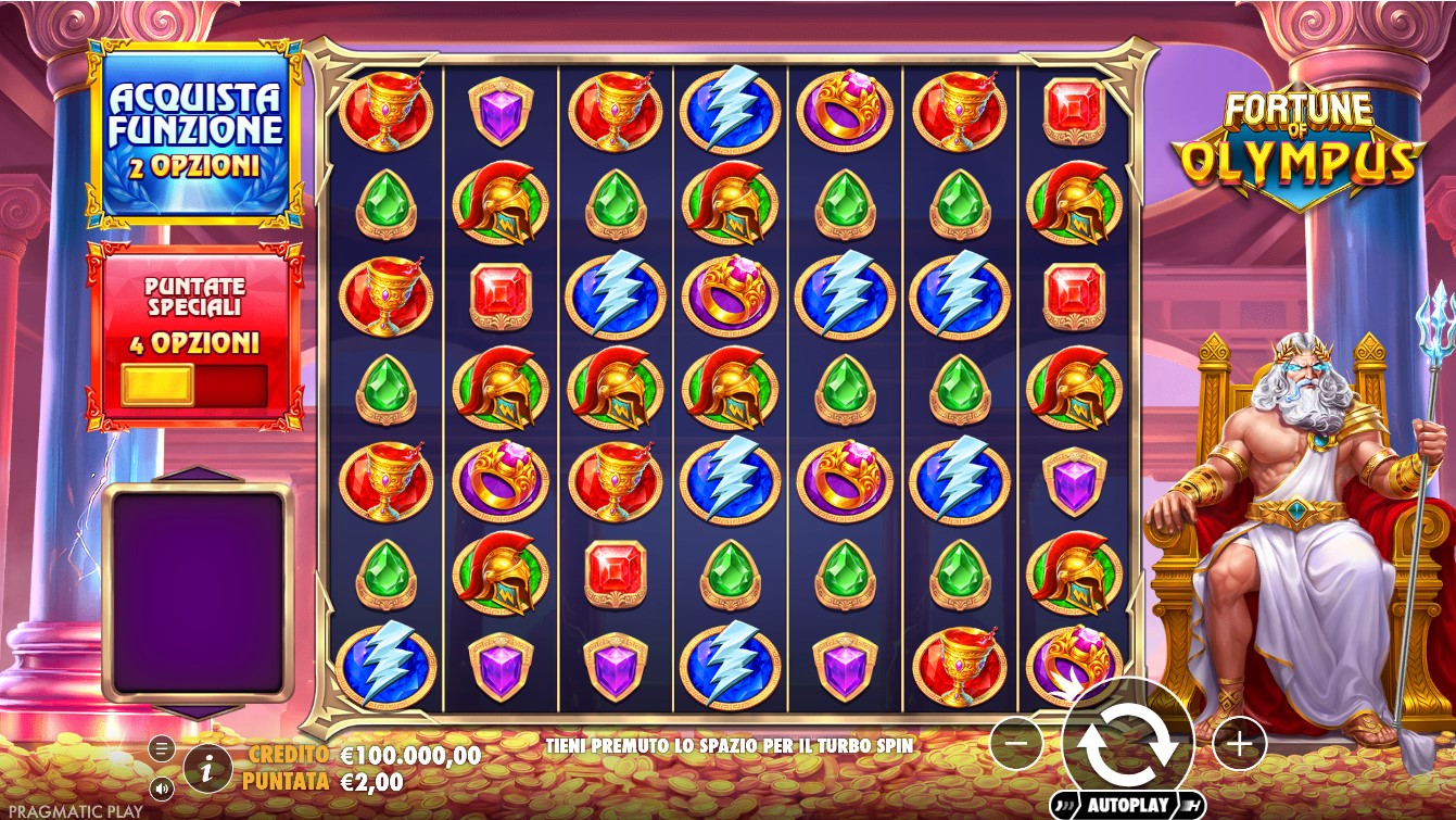 Schermata di gioco della slot Fortune of Olympus, di Pragmatic Play