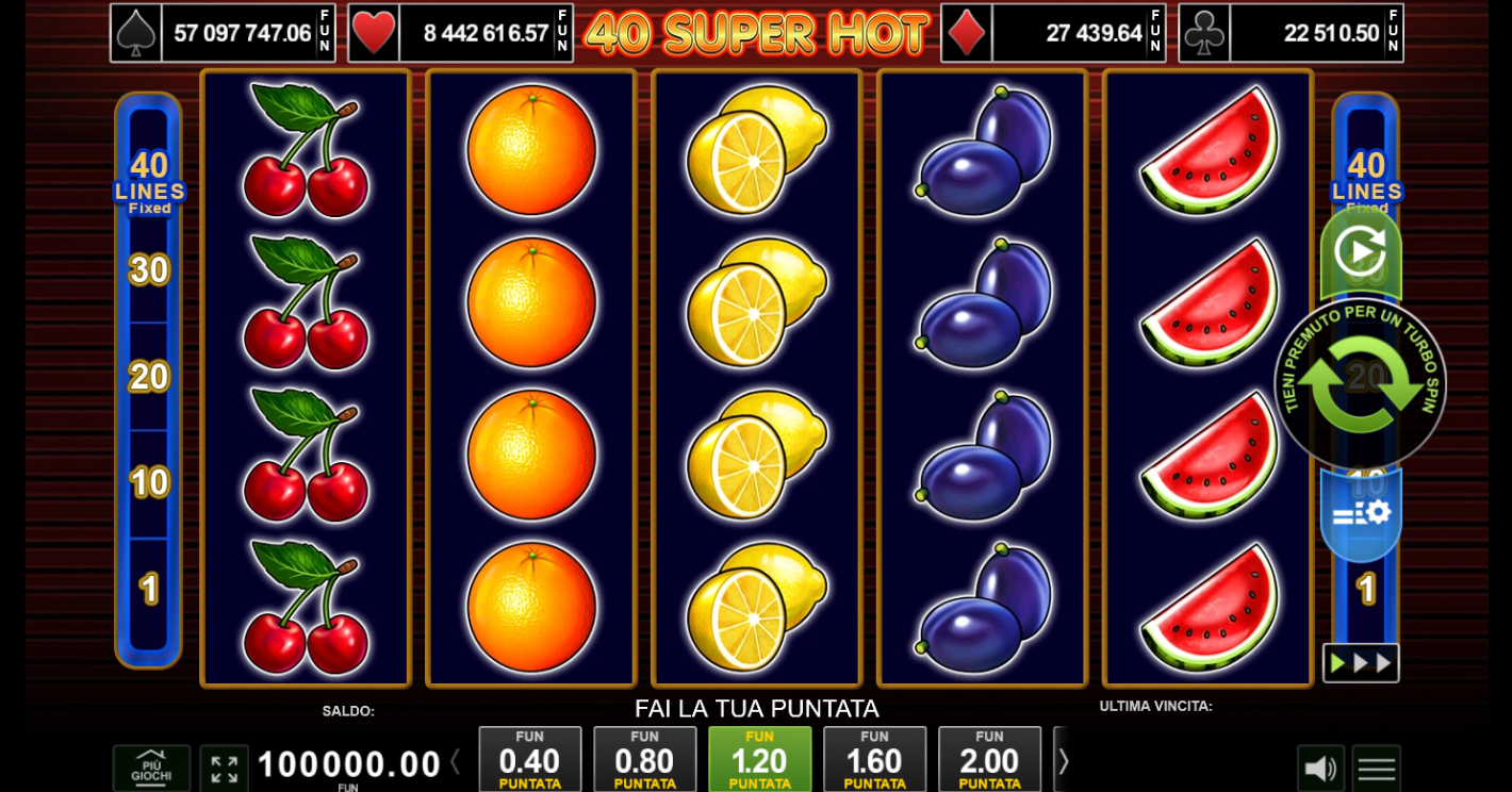 Entriamo più nel dettaglio. In pochi istanti il giocatore si trova davanti la griglia 5x4 del gioco 40 Super Hot. Noterete subito tanta frutta colorata sui rulli. Sulla destra c'è il tasto circolare che li fa partire. Dei suoni adeguati accompagnano le partite, ma eventualmente si possono mutare in un attimo.