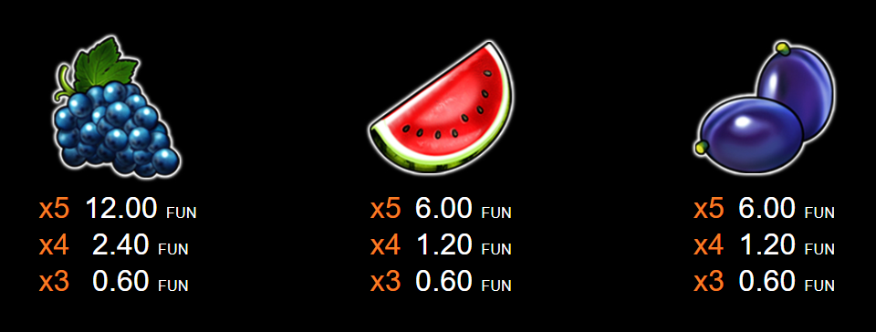 I simboli presenti sono i più classici: limoni, ciliegie, arance ma anche prugne e angurie. L'uva è il simbolo che vale di più tra quelli base. Abbiamo poi Wild e Scatter. Il Wild è un 7 rosso, altro grande classico delle slot. Lo Scatter è una stella gialla che può valere davvero tantissimo. Sono comunque simboli che i giocatori di slot conoscono benissimo. Potete consultare la tabella dei simboli quando preferite tra uno spin e l'altro.