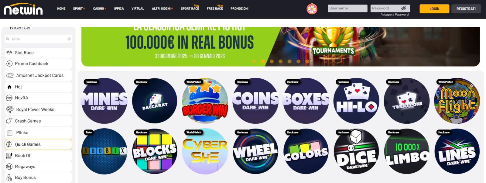 Anche su Netwin Casino è possibile iniziare a giocare a Blocks in modo semplice e veloce. Una volta aperta la homepage del sito, bisogna accedere alla sezione "Slot" e poi aprire la categoria "Quick Games", scorrendo finestra presente sulla sinistra.