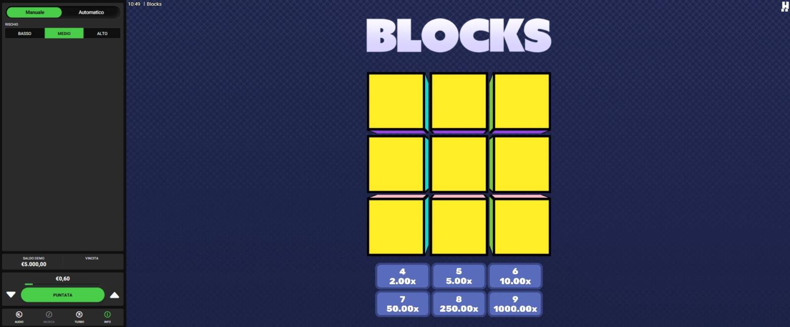 - Gestione del bankroll: L'esito casuale dei turni di Blocks consente al giocatore più conservativo di giocare a rischio basso, o medio, puntando comunque a moltiplicatori interessanti. Se giocato in modo responsabile, questo titolo permette di vivere una sessione ad alta adrenalina, sognando la grande vincita, ma senza perdere il controllo sul proprio budget.