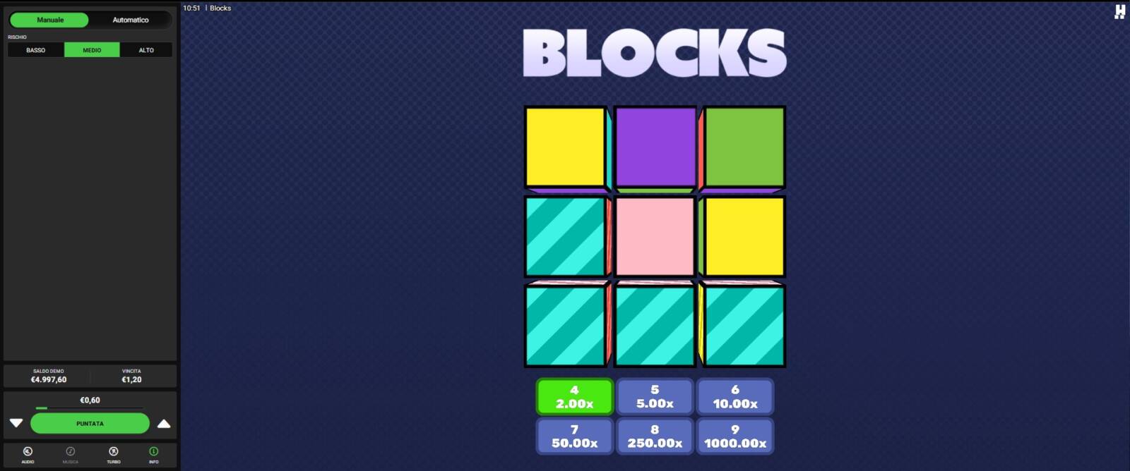 - Regolazione del livello di gioco: Poter livellare la difficoltà del singolo round e, di conseguenza, il valore del moltiplicatore associato alla combinazione di blocchi colorati, permette al player di vivere un'esperienza di gioco allineata al suo stile.