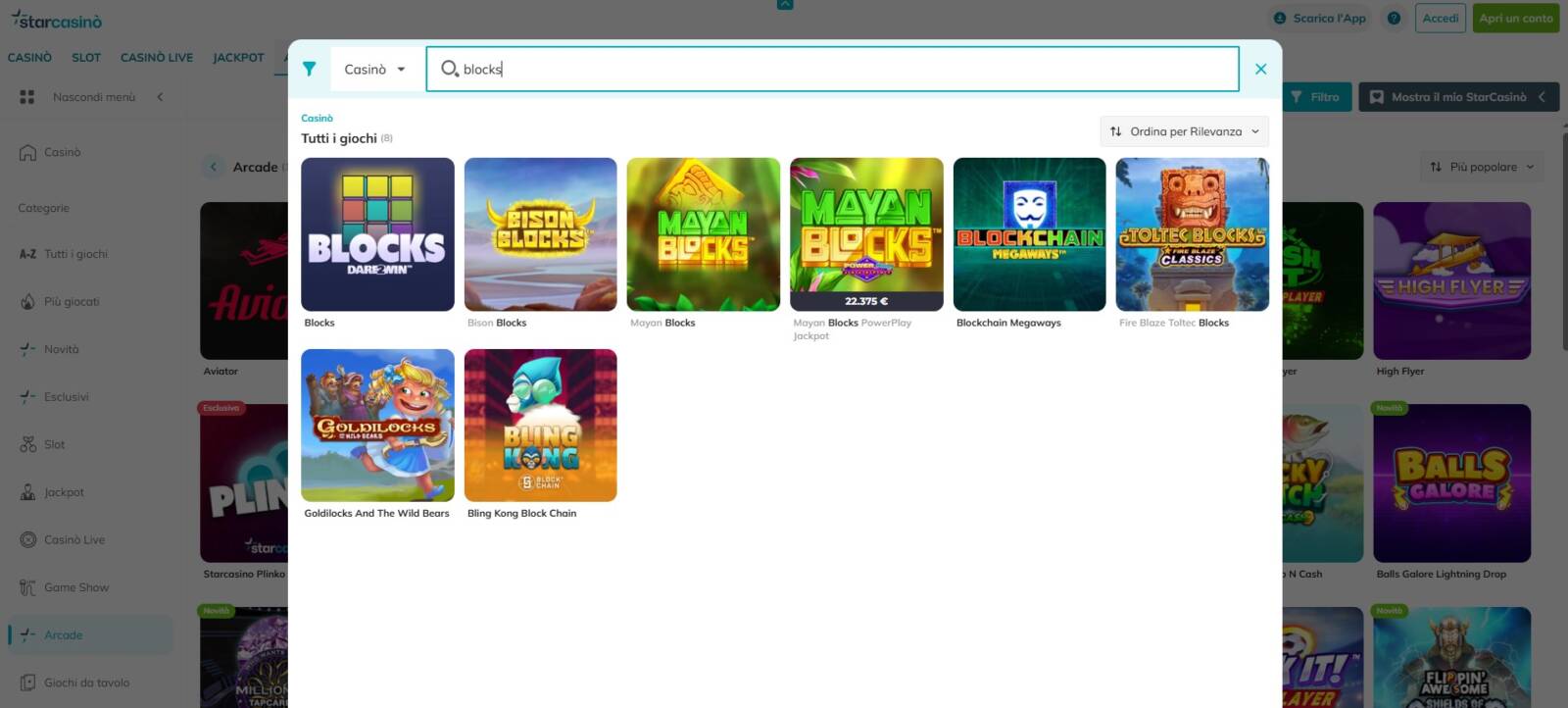 Il terzo operatore che inserisce Blocks nel proprio catalogo di Quick Games è Starcasino. Per trovare il gioco bisogna aprire la sezione "Casinò" e poi scorrere il menù sulla sinistra fino a quando non si trova la categoria "Arcade".