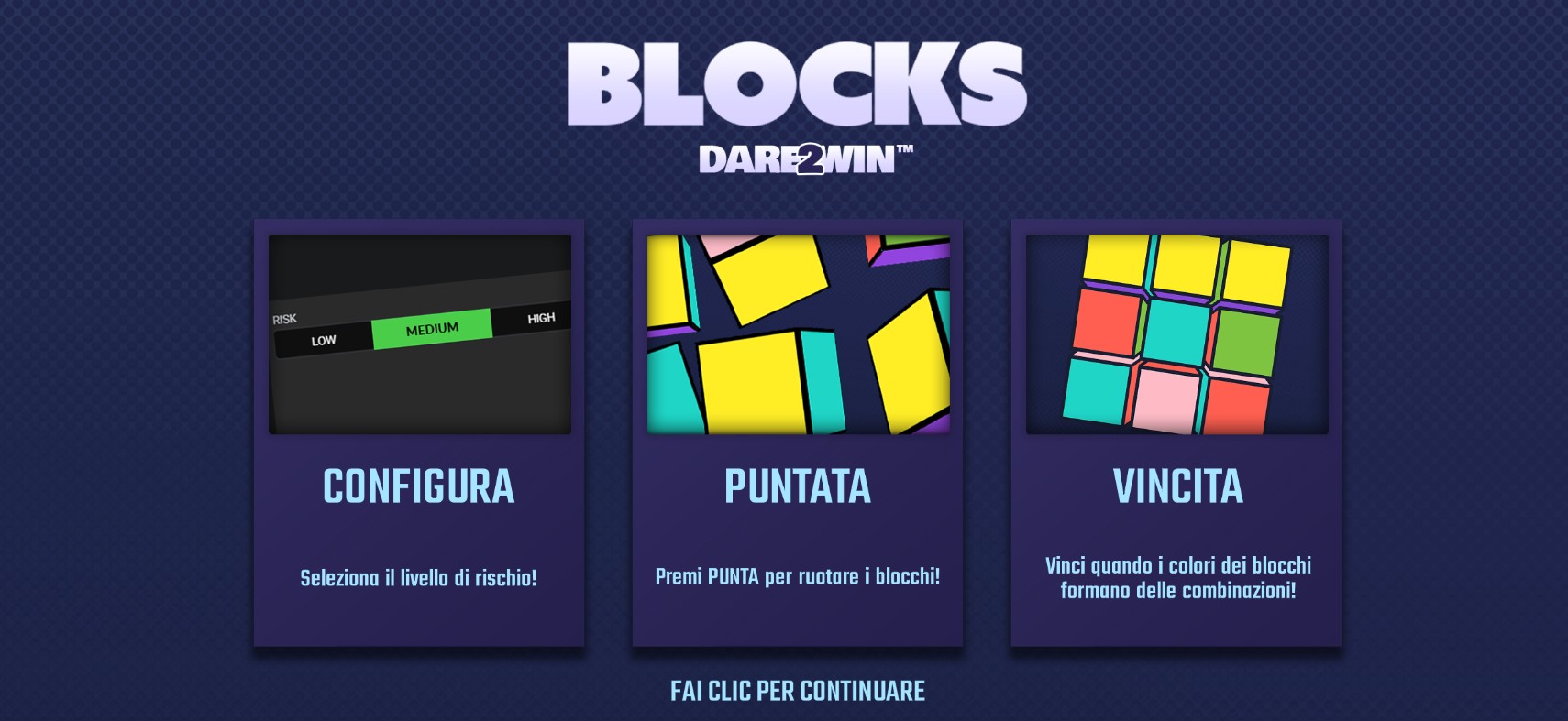 - VINCITA: Se i colori dei blocchi formano delle combinazioni, vinci e riscuoti il tuo premio!