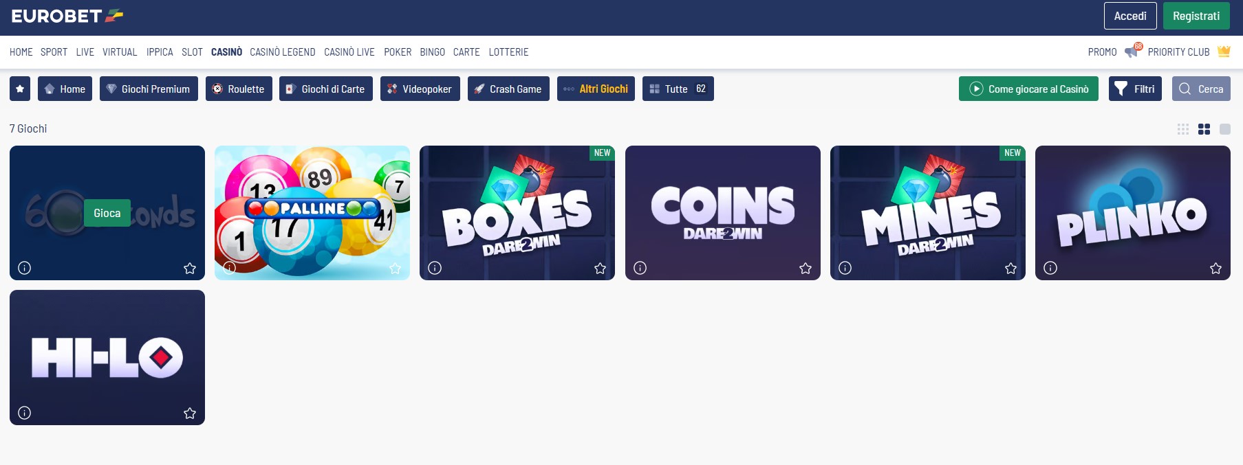 Nel caso di Eurobet, vi basta entrare nella categoria "Casinò", cliccare su "Altri Giochi" e selezionare con immediatezza il vostro Quick Game.