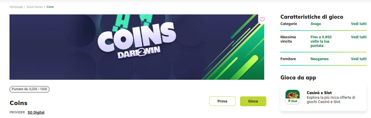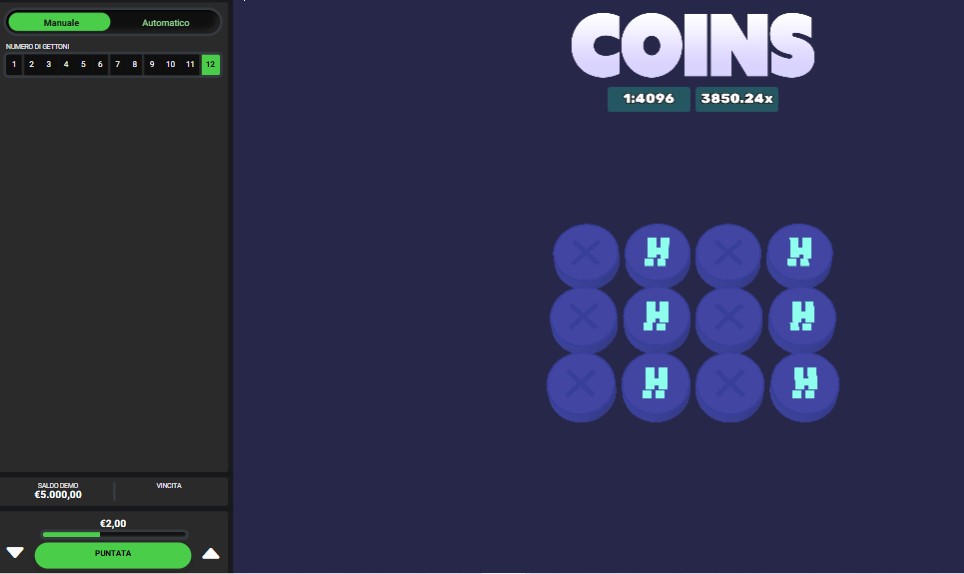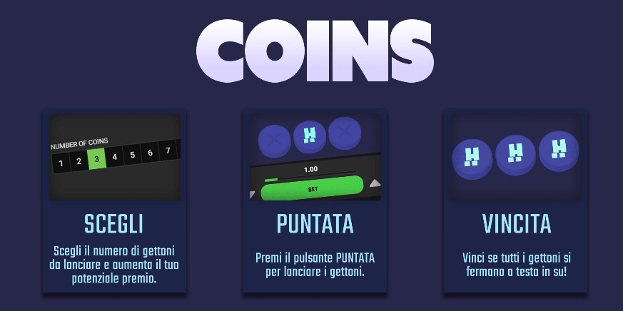 Coins è un Quick Game disponibile in diversi casinò online legali e in possesso di regolare certificazione rilasciata da ADM.