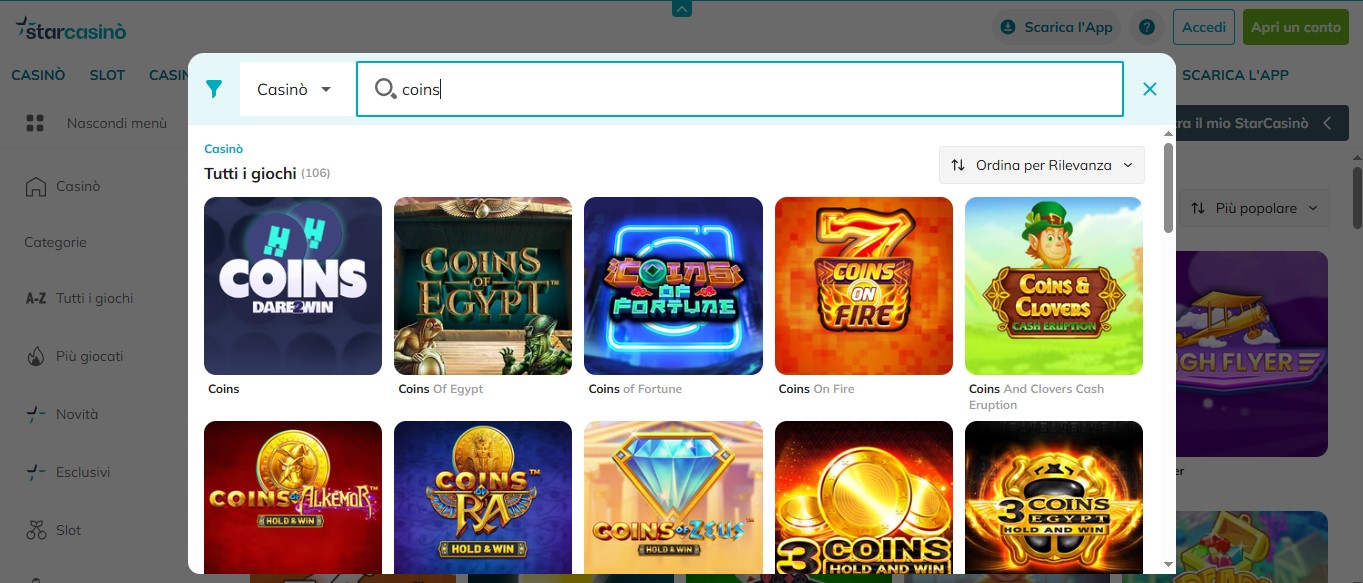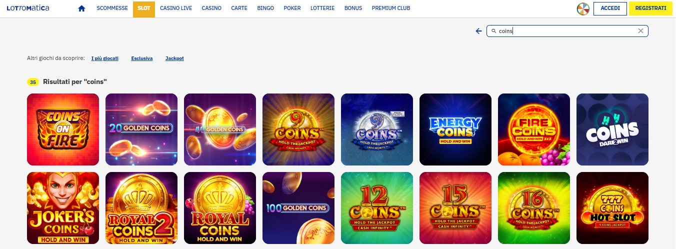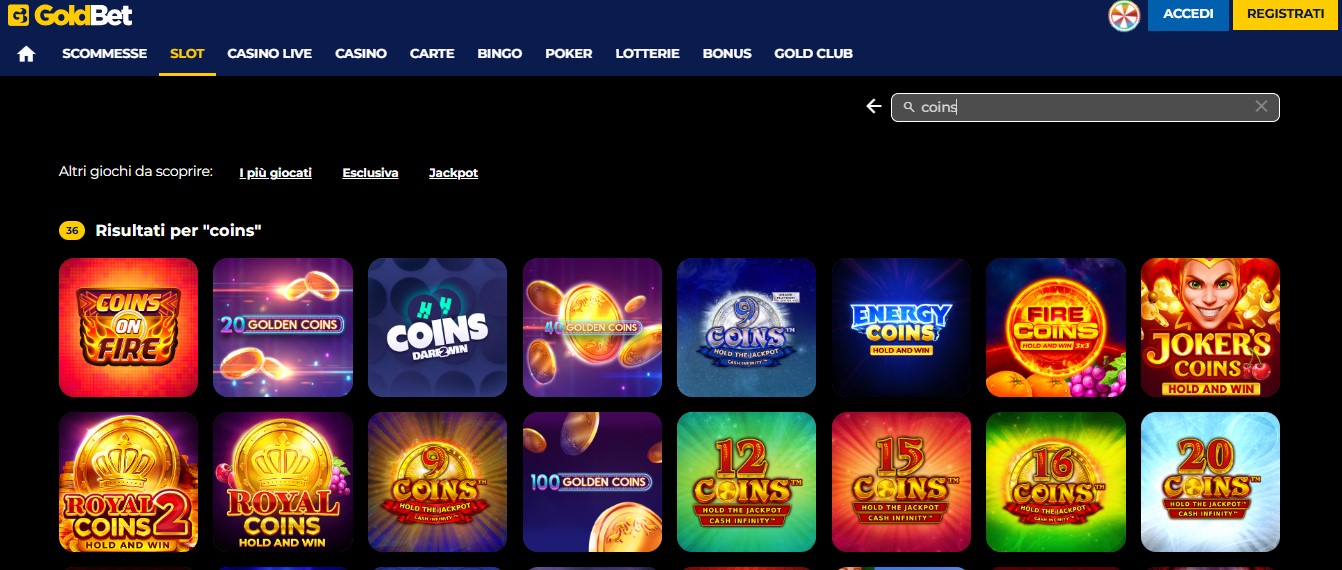 Per scoprire quante e quali versioni alternative di Coins basta accedere al portale dell'operatore selezionato e digitare "coins" nella barra di ricerca.