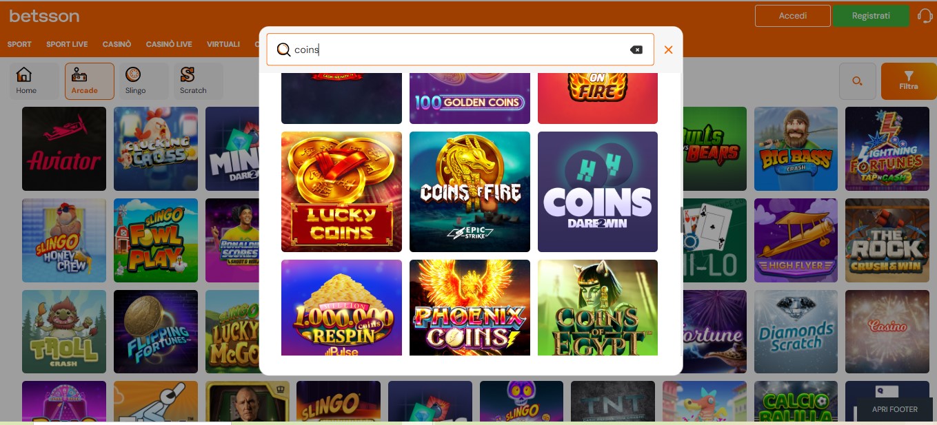 Il gioco Coins è disponibile anche all'interno del portale casinò di Betsson. In questo caso, è necessario aprire la sezione "Arcade", presente in alto sulla sinistra della home page.