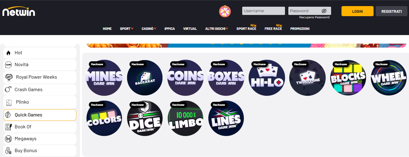 Per giocare a "Coins" sul casinò di Netwin occorre aver completato la registrazione, come tutti gli altri portali. Una volta aperta la sezione casinò, bisogna cliccare sulla categoria "Quick Games" tra le opzioni presenti nella finestra inserita sulla sinistra.