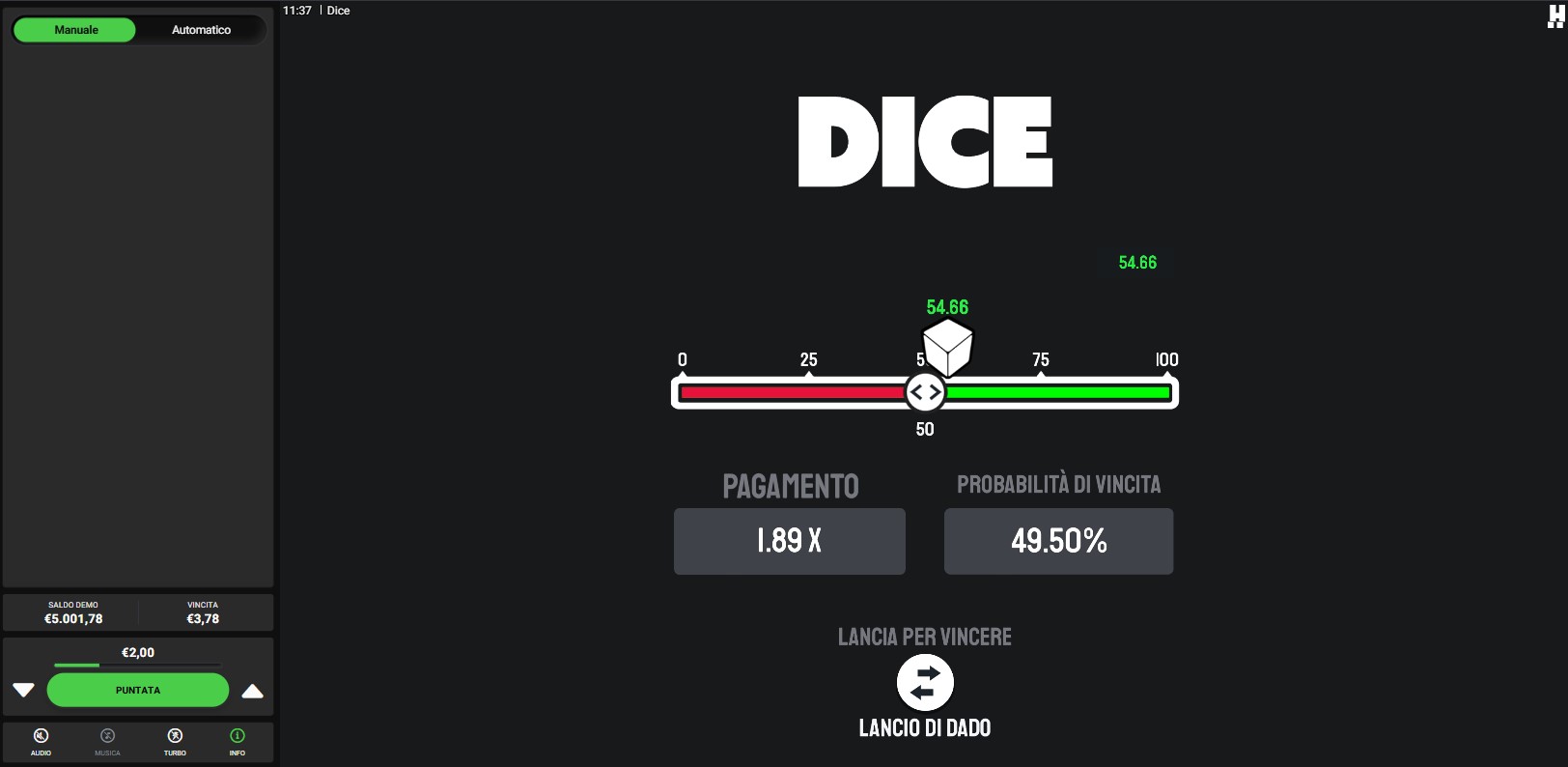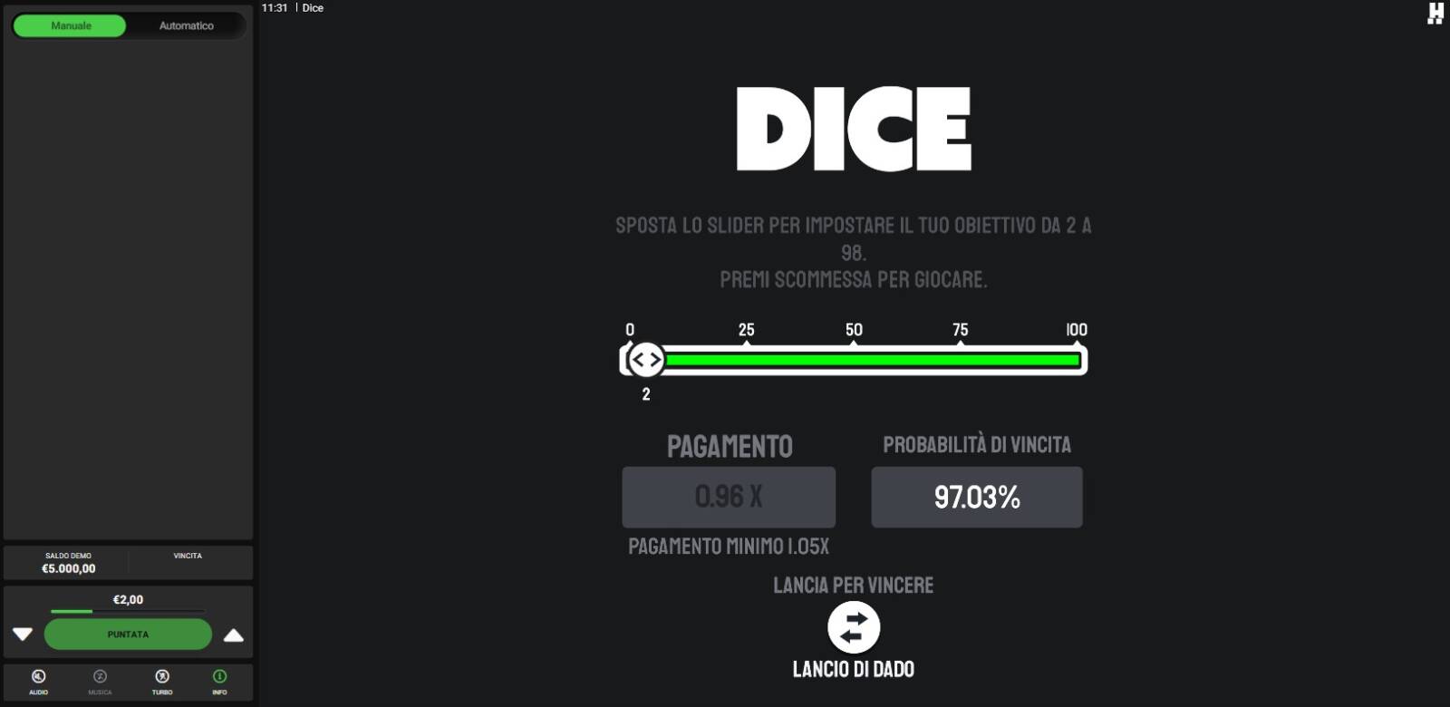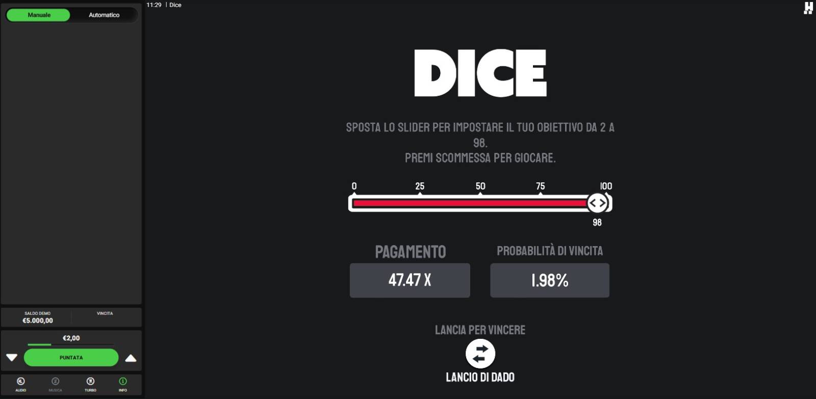 • SCEGLI IL LANCIO DEL DADO: Dice consente di "giocare per vincere", quindi in modalità classica, ma anche di "giocare per perdere". Nel secondo caso, l'obiettivo si ribalta: l'esito se inferiore al limite risulta vincente, mentre se superiore è perdente.
