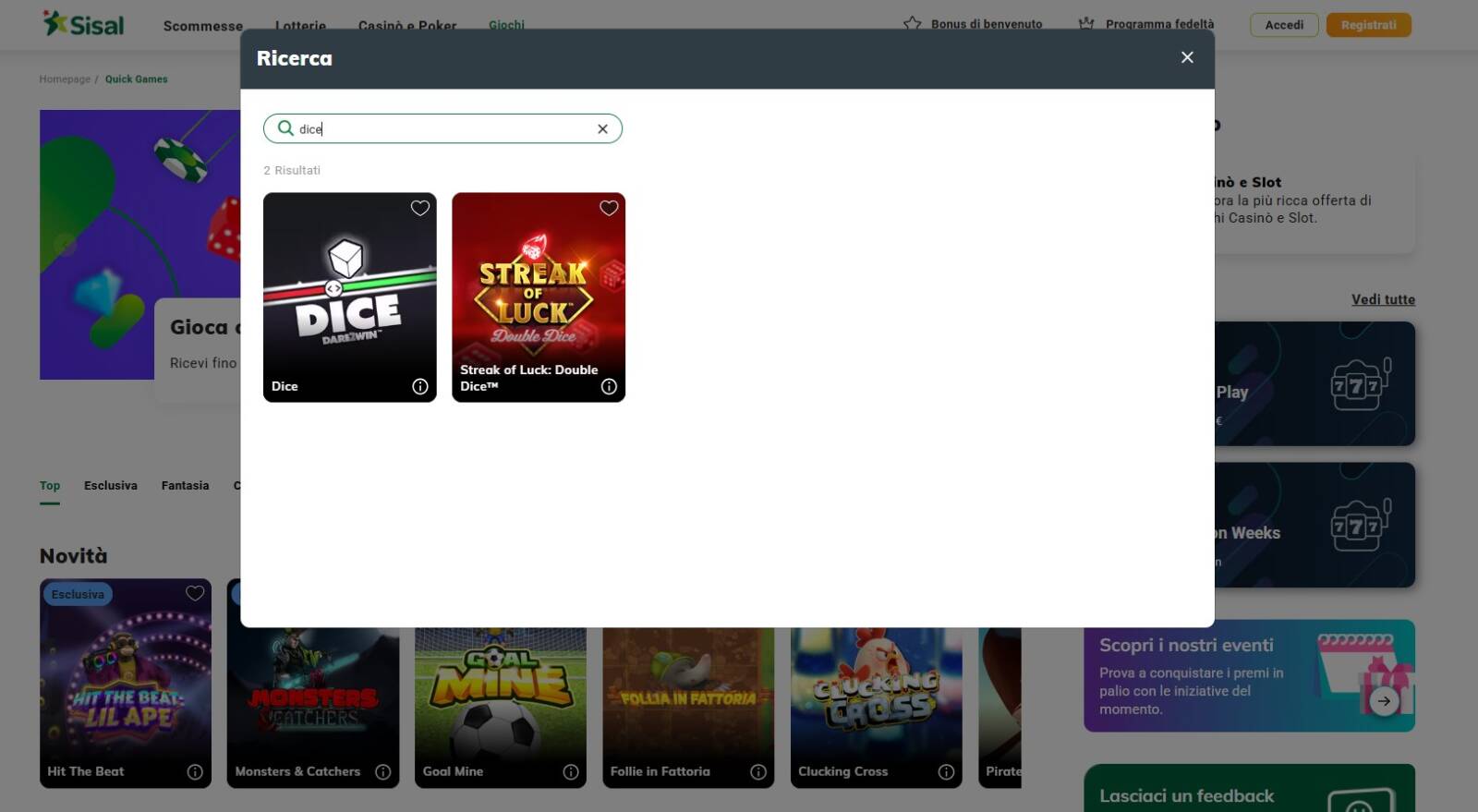 Come trovare il gioco "Dice" su Sisal