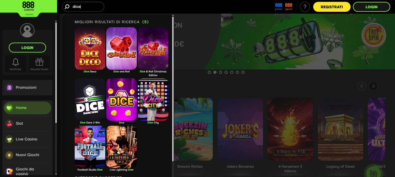 Per scoprire quante e quali versioni alternative di Dice esistono, basta accedere al portale dell'operatore selezionato e digitare "Dice" nella barra di ricerca.