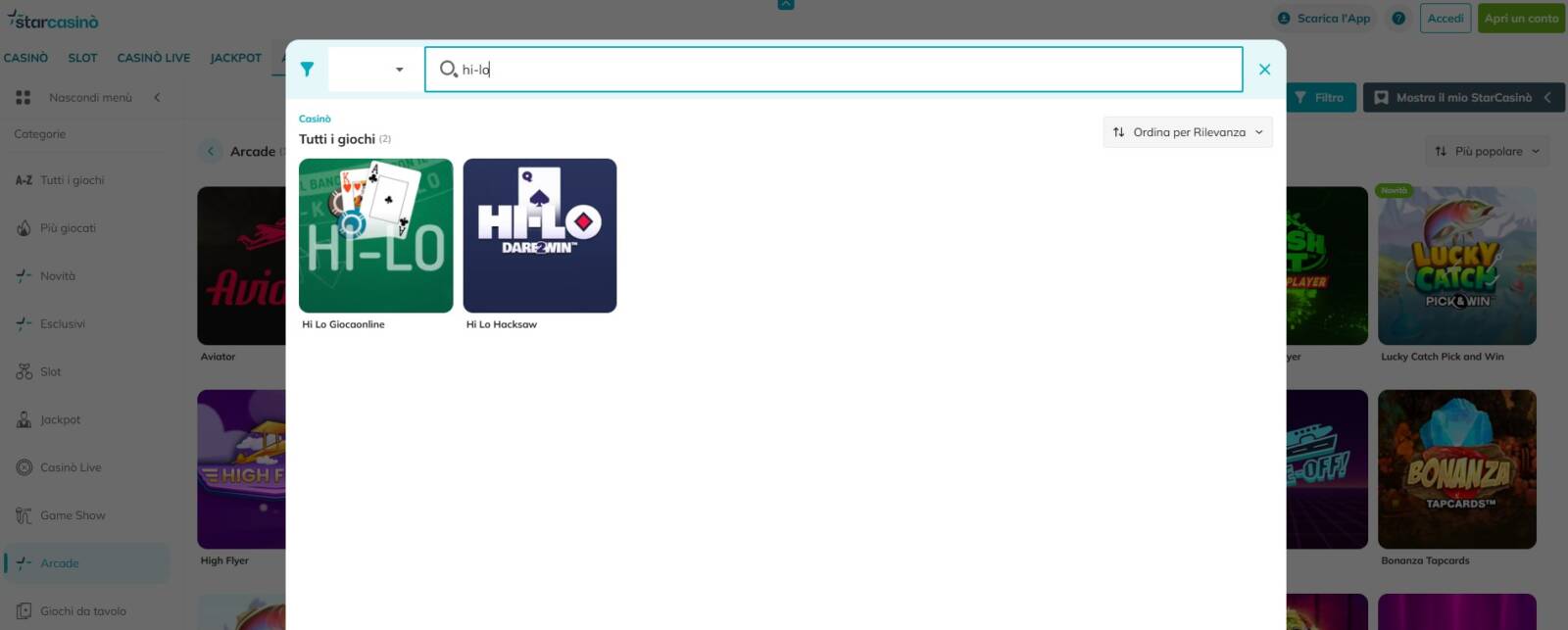 Anche Starcasino inserisce il gioco Hi-Lo a palinsesto. Per accedere al Quick Game basta recarsi nella categoria "Arcade" e cercarlo nella barra di ricerca.