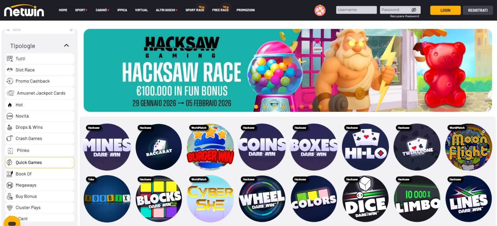 Un altro portale dove trovare Hi-Lo è Netwin Casino. In questo caso, bisogna aprire la categoria "Slot" dalla homepage e poi entrare nella sezione "Quick Games". Il gioco è inserito in prima linea, come visibile sotto.