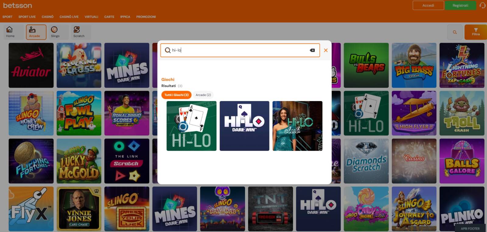 Puoi trovare il Quick Game Hi-Lo anche su Betsson Casinò andando nella categoria "Arcade" e cercandolo sfruttando la barra di ricerca. La versione prodotta da Hacksaw Gaming del gioco è quella nel mezzo tra le tre proposte, come visibile sotto.