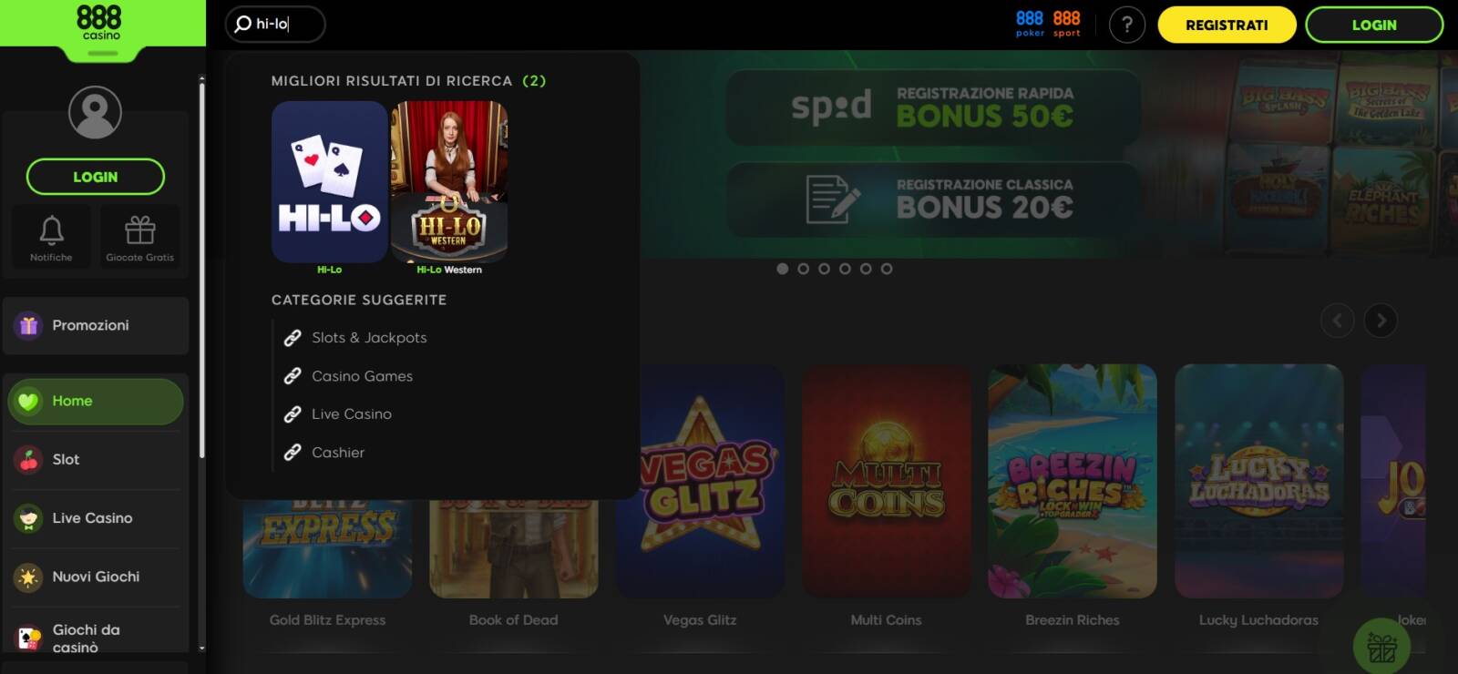 Anche 888 Casino consente ai propri utenti di giocare ad Hi-Lo. Per semplificare la procedura di ricerca, basta scrivere il nome del titolo direttamente dalla "Home" del sito.