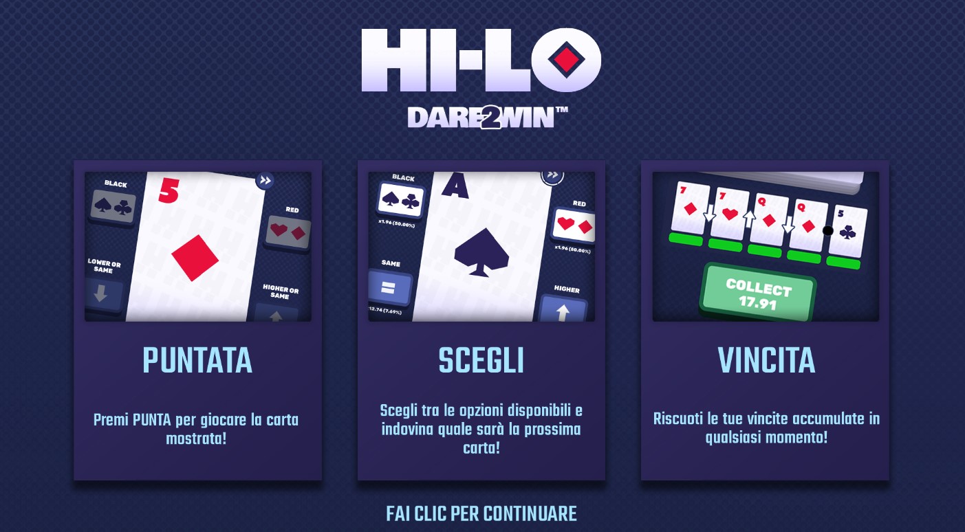 Prima di avviare una sessione di gioco su Hi-Lo, ogni player vede aprirsi una schermata che sintetizza le fasi di gioco e il regolamento.