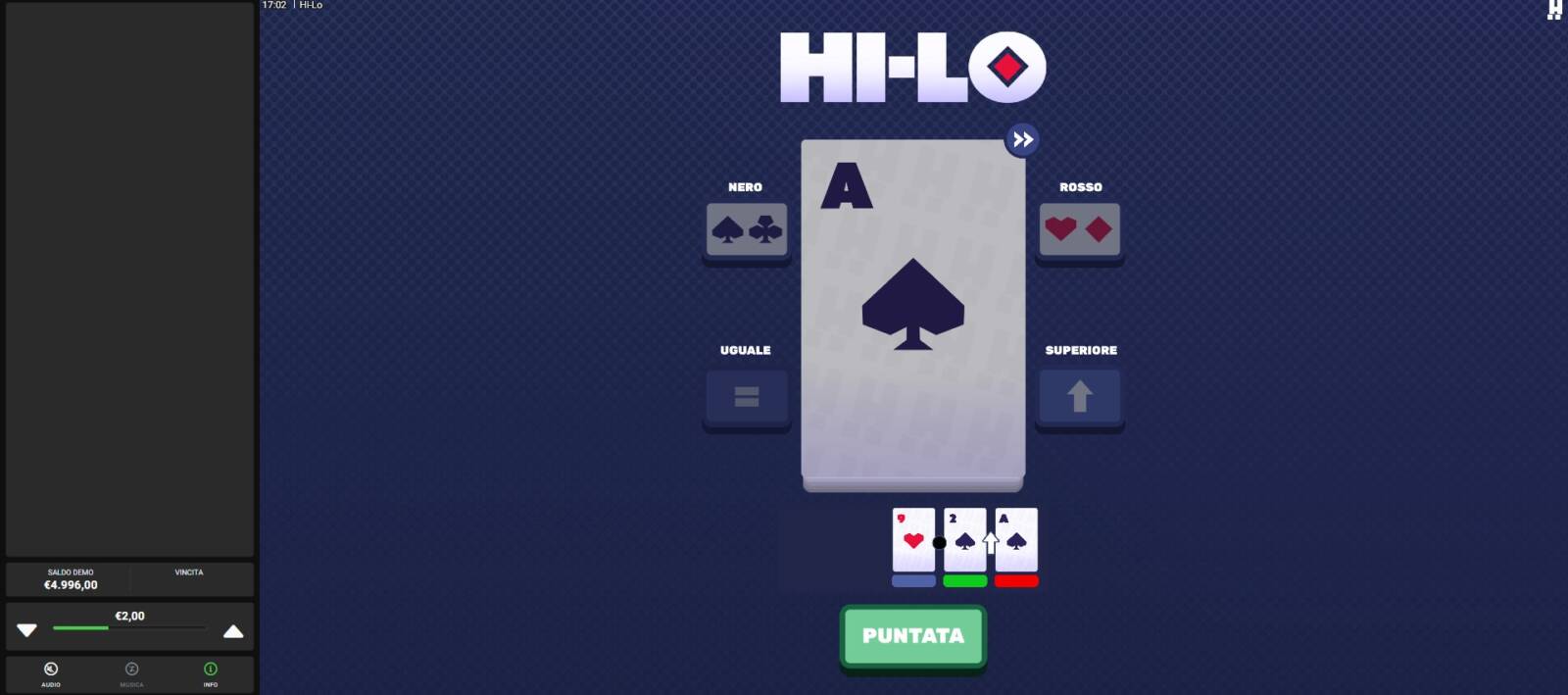 Appena premi uno dei quattro pulsanti, basta premere su "Punta" per dare il via al turno di gioco. Se l'opzione da voi scelta si rivela giusta e indovinate la prossima carta, allora il round risulta vincente e l'importo viene aggiunto al totale riscuotibile.