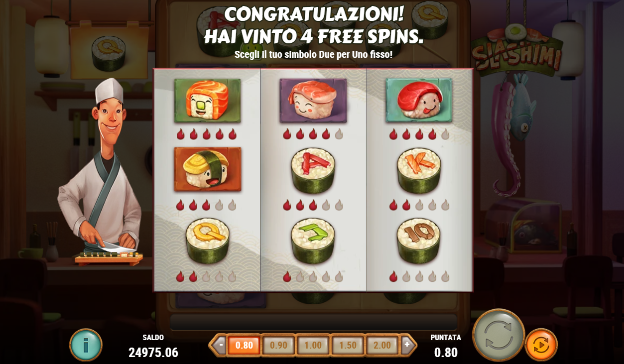 I simboli del gioco riflettono fedelmente il tema culinario, con varie tipologie di sashimi, nigiri e maki che compaiono sui rulli. Le icone di minor valore sono rappresentate da carte da poker stilizzate, mentre quelle di maggior valore includono prelibatezze giapponesi. Una combinazione vincente di questi simboli può portare a vincite che variano da 0,1 a 0,5 volte la puntata.