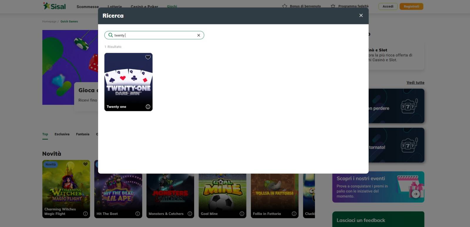 Il gioco Twenty One è disponibile online per tutti gli utenti regolarmente iscritti su Sisal Casino. Per iniziare a giocarci basta aprire la sezione "Giochi" dalla homepage del sito e cliccare sulla barra di ricerca, digitando il nome del Quick Game.