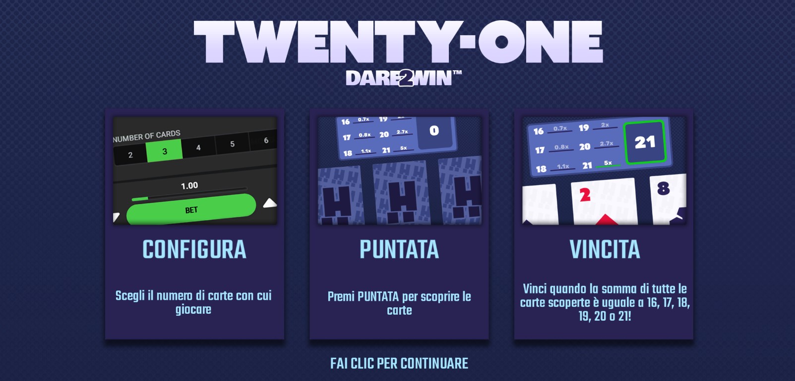 - Volatilità: Twenty One è un Quick Game che ha un'alta volatilità, quindi non particolarmente adatto a chi ricerca il grande jackpot.