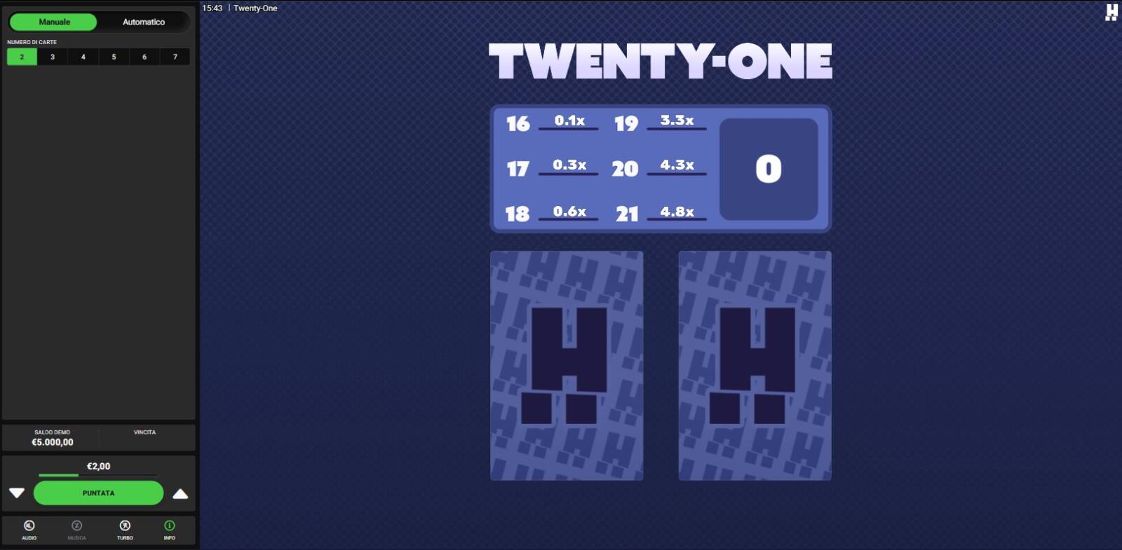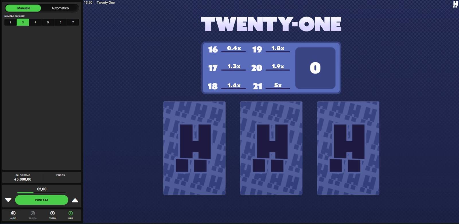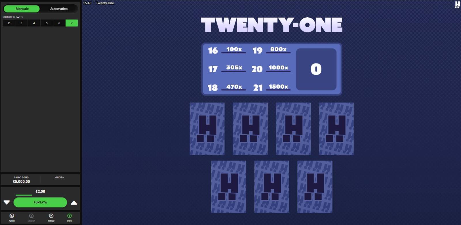 Dopo aver scelto il numero di carte, basta premere su "Puntata" per avviare un turno di gioco su Twenty One. Per avere la possibilità di vincere la vincita massima pari a 1.500x il livello di puntata, occorre giocare con 7 carte (il massimo).