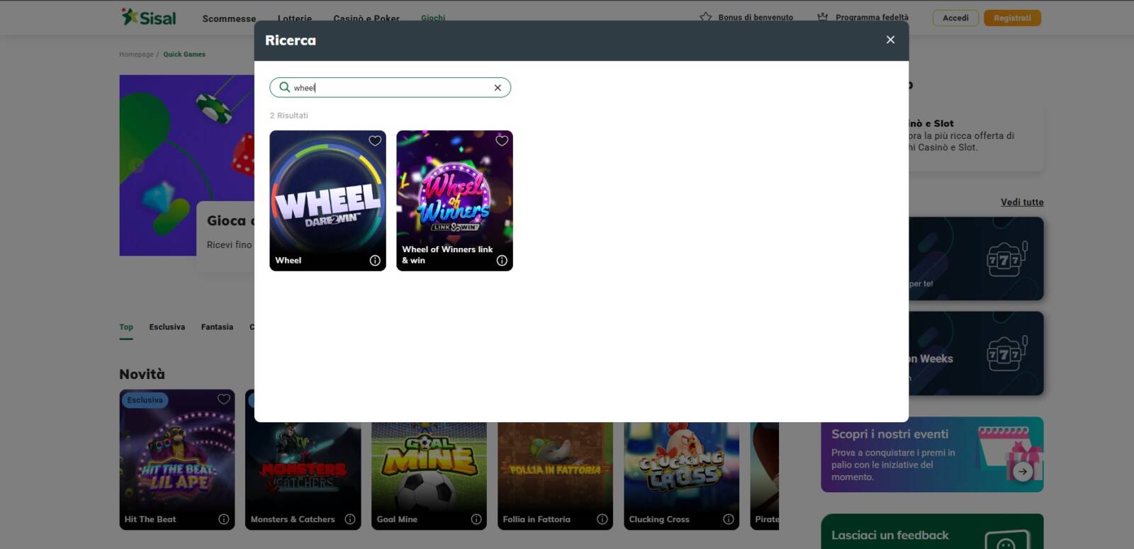 Tutti i clienti registrati correttamente a Sisal possono divertirsi giocando a Wheel. Per trovare il gioco bisogna recarsi nella categoria "Giochi" e poi selezionare "Quick Games" tra le opzioni inserite nel menù sulla sinistra.