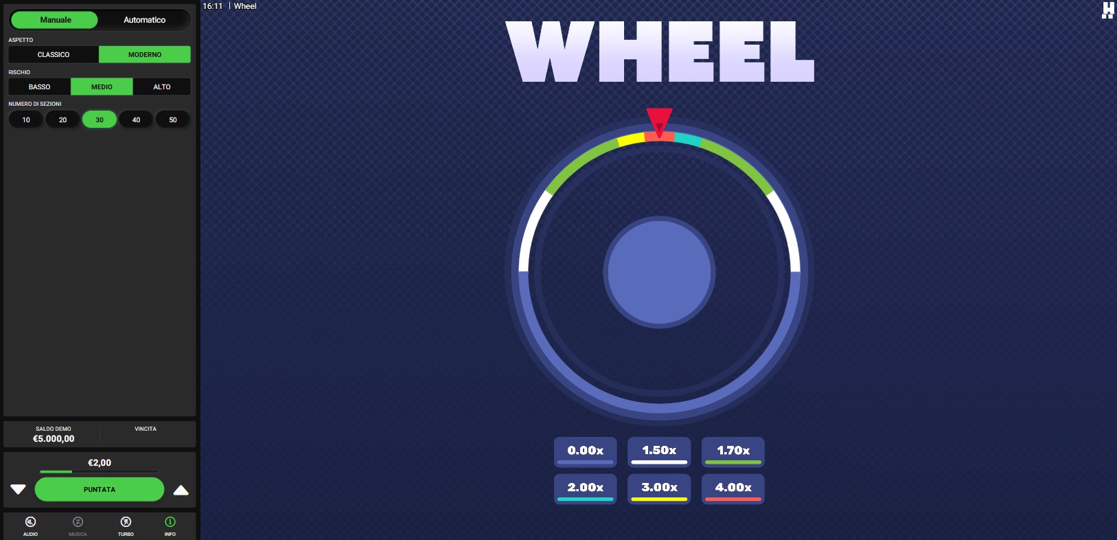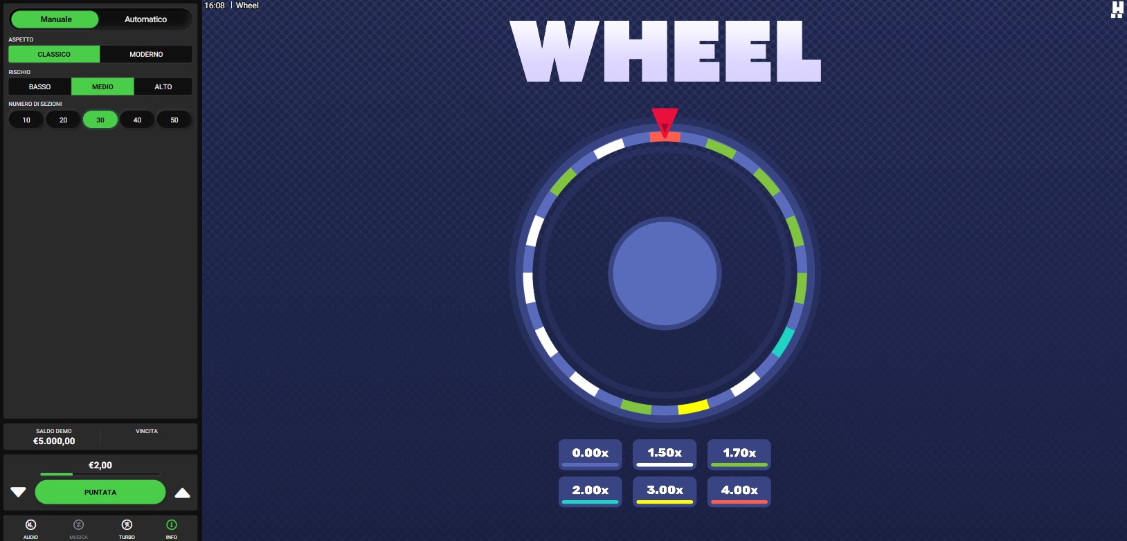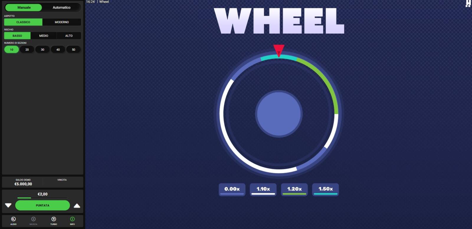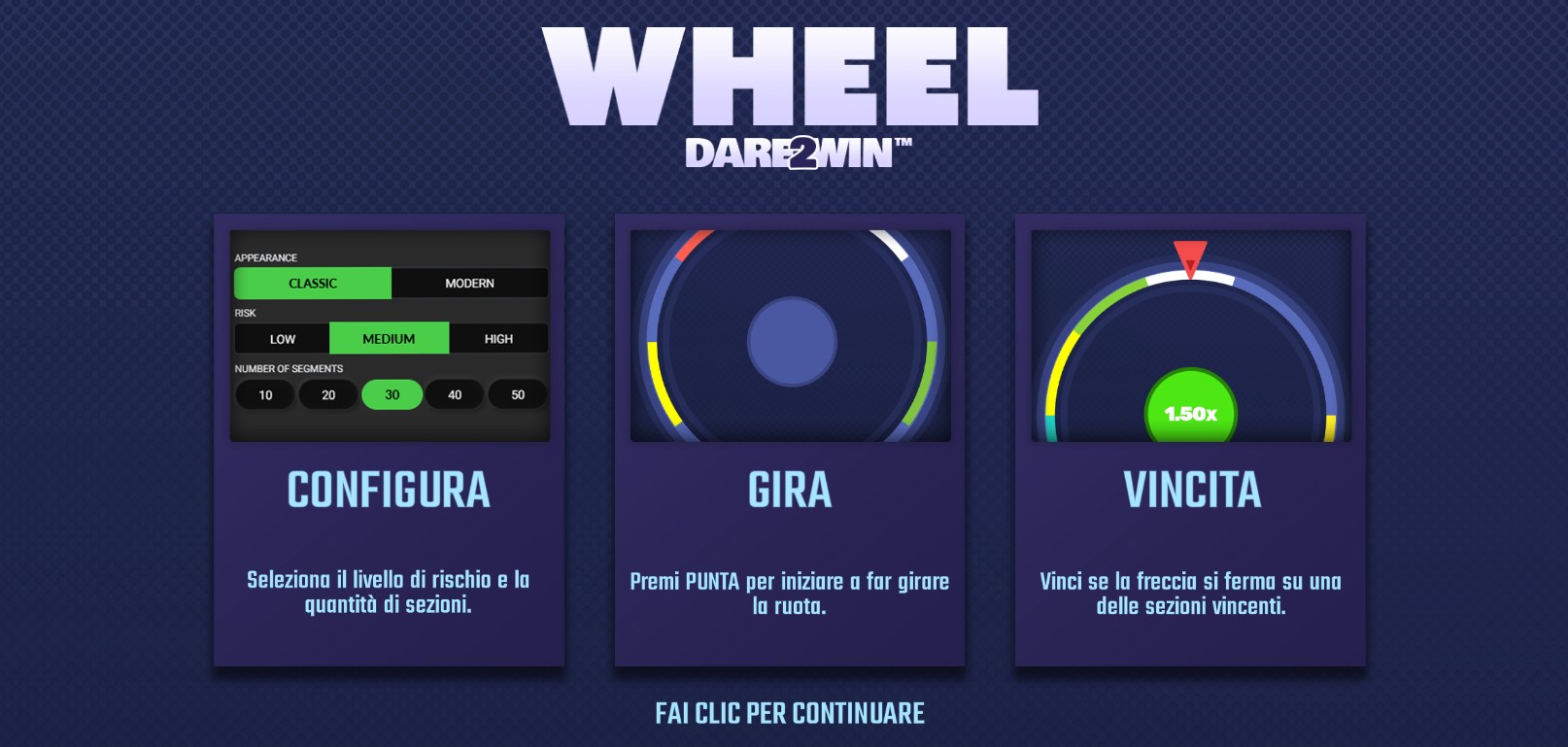 Wheel permette ad ogni giocatore di configurare il turno di gioco in base al proprio stile e al potenziale di vincita desiderato. Ad impattare non c'è solo il livello di puntata, ma anche il numero di sezioni e il livello di rischio.