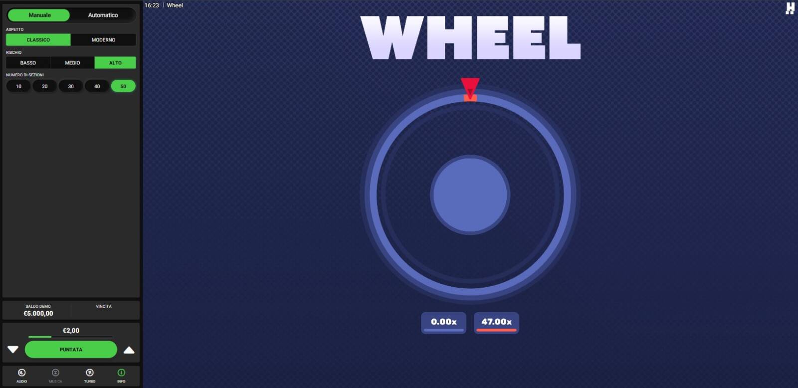 - Margine di profitto: Wheel è un gioco a bassa volatilità, adatto ai giocatori che non possiedono budget troppo alti. Le vincite degli importi ridotti sono più frequenti dei grandi jackpot. Se non si regola nel modo più equilibrato il numero di sezioni e il rischio di gioco, il profitto potrebbe essere nullo o minimo.