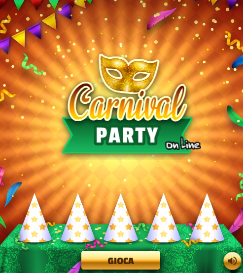 L’interfaccia grafica del Gratta e Vinci Carnival Party è articolata in diverse sezioni: da una parte si trova l’immagine di una parete con 50 maschere di carnevale molto colorate e quella di un tavolo coperto da una tovaglia verde sulla quale sono posti cinque cappellini di carnevale.