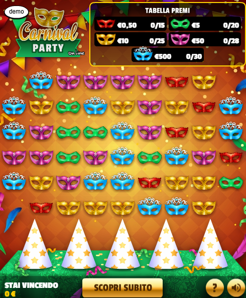 Carnival Party è un particolare e colorato Gratta e Vinci online che permette di vivere l’emozione e le atmosfere del carnevale con un costo di appena 50 centesimi. Il premio massimo ammonta invece a 500 euro. Somme che non mettono troppa ansia e consentono delle partite in leggerezza. Cos'altro c'è da sapere?