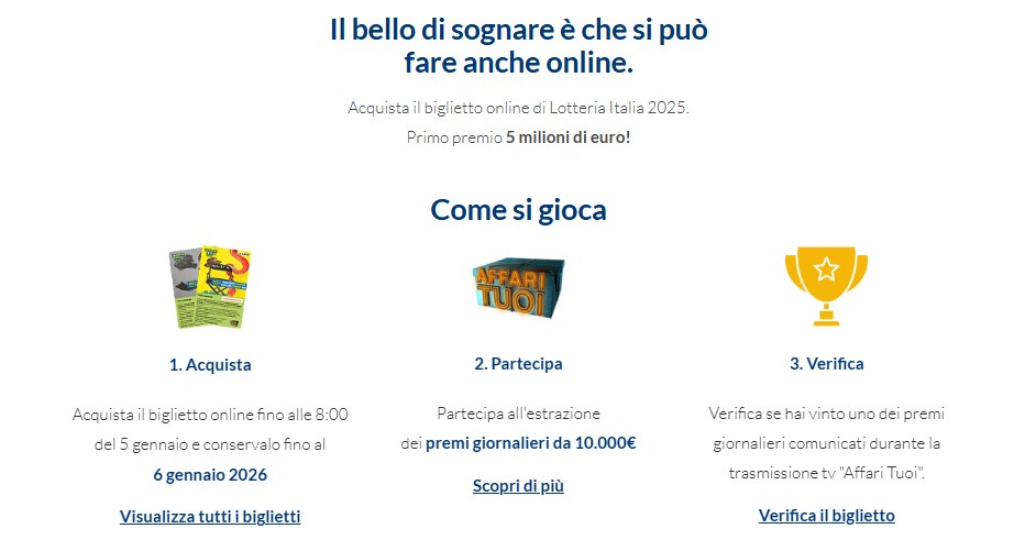 I passi da seguire per acquistare un biglietto della Lotteria Italia 2025 online su Lottomatica e verificare l'eventuale vincita sono: