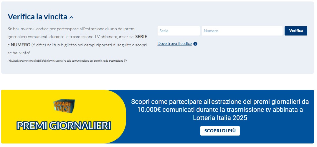 Oltre alla possibilità di acquistare il biglietto di Lotteria Italia e di partecipare all'estrazione dei premi giornalieri, il sito di Lottomatica consente ai propri utenti anche di verificare la vincita di uno dei premi giornalieri comunicati durante la trasmissione "Affari Tuoi".