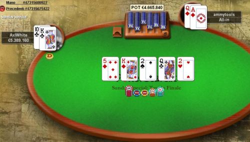Nell’heads up finale AxlWhite si presenta con 7.8 milioni di chips contro i 2.2 milioni di ammytools. Il chip leader arriva anche ad uno stack otto volte superiore all’avversario che però è bravo a rimontare e portarsi a ridosso. Ma AxlWhite non si scompone, è una lenta guerra di posizione. Dopo quasi 40 minuti, arriva lo scontro decisivo con A Q di ammytools e K 10 di AxlWhite, su un board 5 K 2 Q 2 che consegna la prestigiosa vittoria del Sunday Special a Potenza.