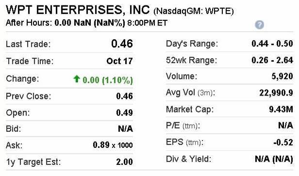 Quello che è fuor di dubbio, è che oggi le azioni di WPT Enterprise ltd. (WPTE) si possono comprare (vedi immagine sotto) ad appena 0.46$ cadauna. Altrettanto certi sono i tanti soldi che la stessa dovrà sborsare a Cryptologic per uscire dal suddetto accordo.