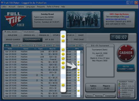 Cerca gli smiles, le faccine sorridenti, nelle lobby dei tornei e dei giochi per trovare i nuovi tavoli Happy Hour, dove potrai raddoppiare o triplicare i tuoi punti Full Tilt.