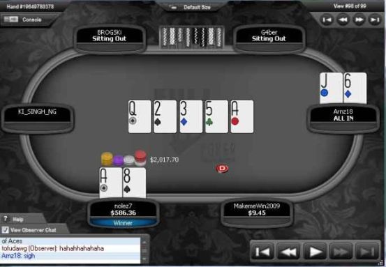 Il piatto più ricco di questa folle roulette, pari a 2.018 dollari, "nolez7" lo ha vinto contro "Arnz18", quando i due sono andati all-in preflop rispettivamente con a 8 e j 6 ed il board è giunto q 2 3 5 a , come potete vedere nell'immagine qua sotto.