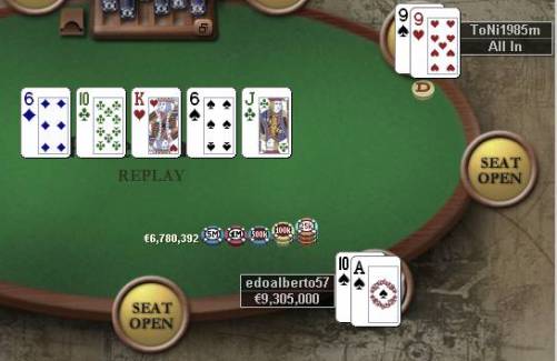 Il final table va avanti, diventando una sorta di "festival dello scoppio": il povero TEODERICO, che aveva subito da poco un brutto colpo, trova uno spot favorevole per raddoppiare, ma i suoi a q trovano un board 9 10 6 3 10 che regala un piatto da oltre due milioni ai a 9 di edoalberto57, mentre il sardo TEODERICO è out.