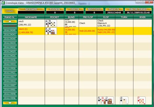 Tra i protagonisti balzava con prepotenza JAWS, che faceva sua l'intera posta dopo un heads up dominato contro vinc5. Nell'ultima mano JAWS, ormai strachipleader ad oltre 2,4 milioni contro 280 mila, sceglie l'ardita strada dello "slowlimp" con i suoi k k , che trovava efficacia quando l'avversario, dopo il check da big blind, centrava una top pair con i suoi q 8 sul flop 5 q j . E' la fine per lui che mandava tutto, venendo ovviamente chiamato. Turn 2 e river 7 consegnavano la vittoria e gli oltre 11mila euro a JAWS.