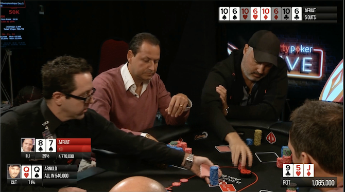 Da HJ Eric Afriat, che alla fine del torneo chiuderà in the money al 128° posto, spilla 8 7 , il suited connector che decide di limpare a sua volta, ma un posto dopo, con uno stack di 715.000, Arnold apre le sue donne con una size convincente, 175.000, ma non troppo per eliminare dal piatto l'over limper, Afriat, che giocherà il colpo fuori posizione, dopo il fold dei bui e di Bruno.