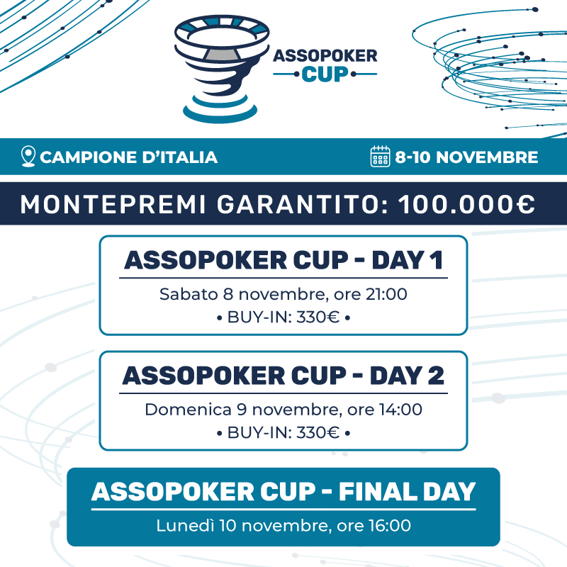 Dall’8 al 10 novembre 2025, il Casinò di Campione d’Italia ospiterà l’Assopoker Cup, un torneo live esclusivo con un montepremi garantito di €100.000 e un buy-in di €330. Questo evento speciale celebra i 20 anni di Assopoker.com, il primo sito italiano dedicato agli appassionati di poker. Da un leggendario forum di discussione, che per anni ha riunito la community del poker, ai moderni canali social, Assopoker continua a essere il punto di riferimento per chi vive il poker con passione. L’Assopoker Cup sarà una festa indimenticabile: un’occasione unica per giocare un torneo di alto livello, incontrare amministratori, collaboratori, amici attuali e passati, e scoprire sorprese speciali.