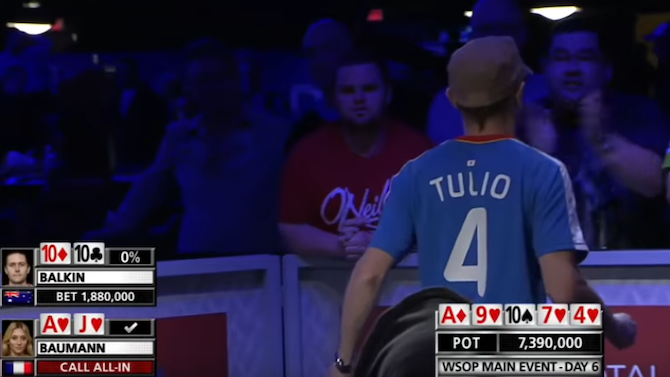 Siamo a una ventina di giocatori left al Main Event del 2012 e David, con la sua spigliata e fiera T-Shirt con il nome “Tulio” sulle spalle, spilla altrettanto fieramente una coppia di 10 da early position, onorandola con un mini raise a 220.000 su bui 50k/100k/10k.